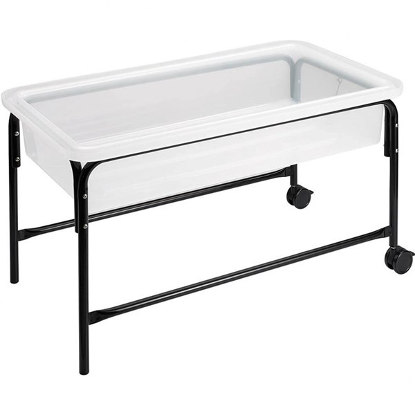 This strong and versatile plastic play tray features a water release plug in the bottom for easy discharge - Includes a strong tubular frame fitted with two lockable casters for easy movement