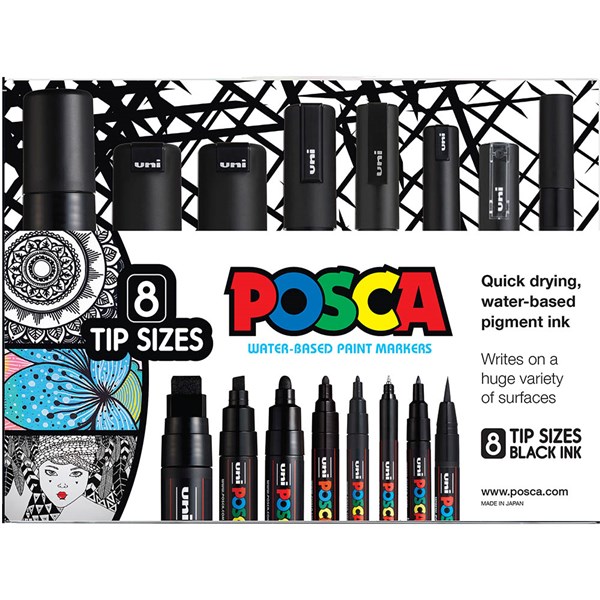 POSCA PAINT MARKERS ASSORTED TIP SIZES BLACK PACK 8